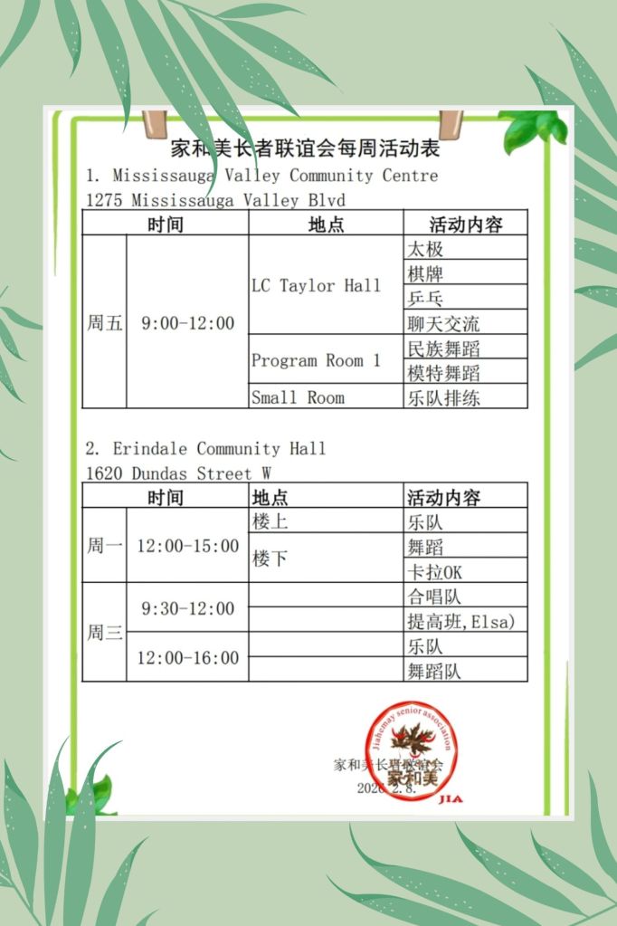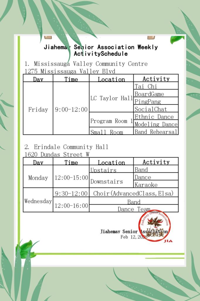 Government of Ontario. Since its establishment with the support of the Canadian government and the community Center, the association has successfully held various forms of literature and art sports activities and training courses, which have activated the spiritual and cultural life of the elderly in the community, making them more healthy and energetic. The current activities include musical instrument team, chorus,square dance, Tai Chi kung fu fan, line dance, table tennis chess and cards, etc. The community also actively conducts online courses according to the characteristics of the elderly, regularly holds dietary health and travel safety precautions for the elderly, etc. The association also actively participates in artistic performances under the government’s advocacy. Large parties are also held during major festivals.