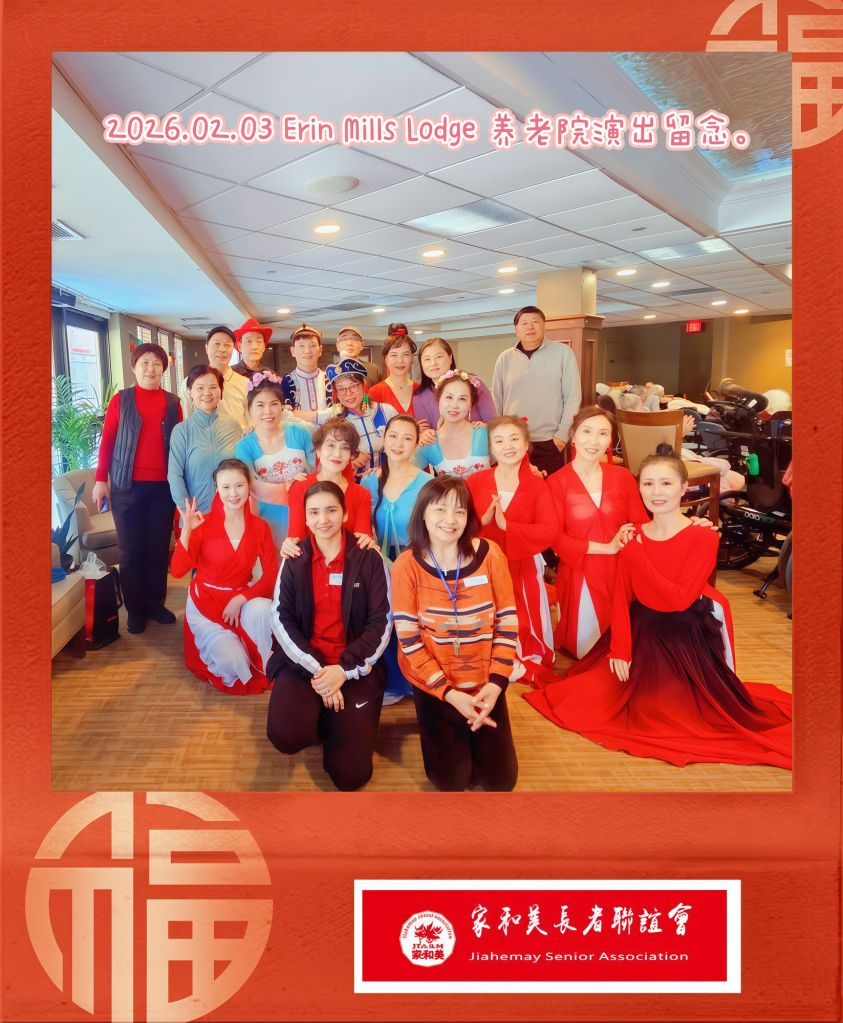 2 月 3 日,我们在 Erin Mills Lodge 养老院举办了新春演出,共呈现 12 个精彩节目。演出现场气氛热烈,长者们全程参与互动,连坐在轮椅上的观众也跟着一起舞动。最后一个节目尤为精彩,赢得了大家的一致好评。